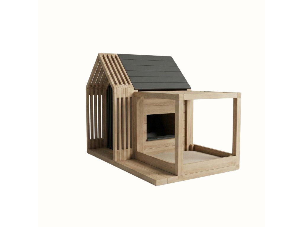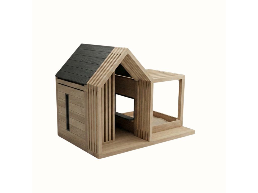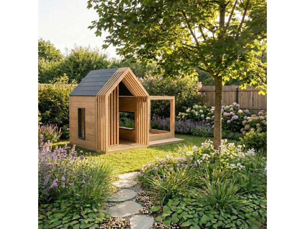 Minimalistický dizajn a prírodné drevo zároveň zabezpečujú, že domček prirodzene zapadne do modernej záhrady.