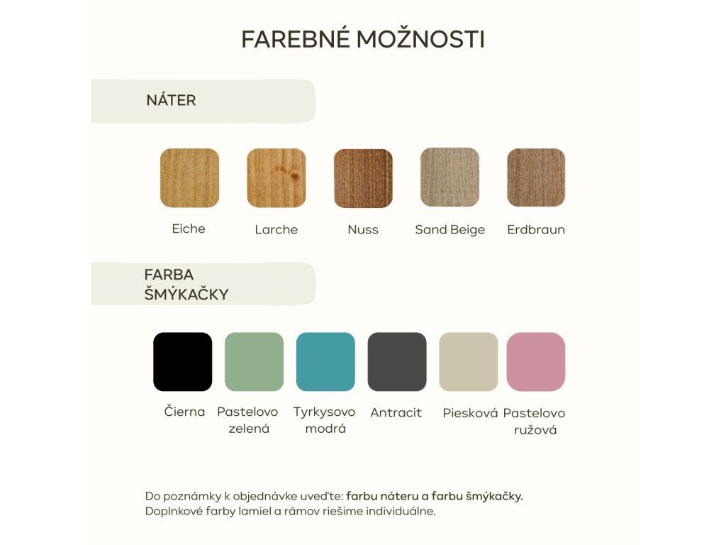 Farbu šmýkačky a farbu náteru (pri voľbe „S náterom“) uveďte do poznámky k objednávke.