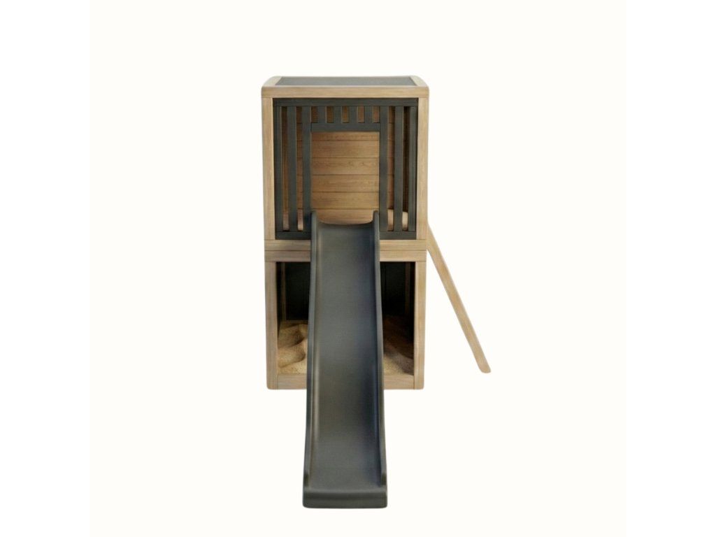 Tabuľová stena umožňuje deťom kresliť, písať alebo vytvárať vlastné príbehy priamo v domčeku. Bočná lamelová stena zároveň vytvára čiastočný úkryt a dodáva domčeku výraznejší architektonický charakter.